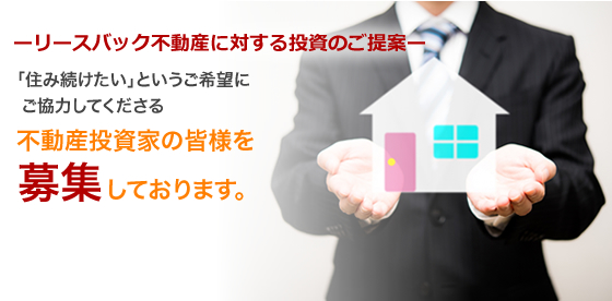 債務者の方にリースバックをおすすめするとともに、リースバック不動産に対する投資・ご協力頂ける不動産投資家の皆様を募集しております。